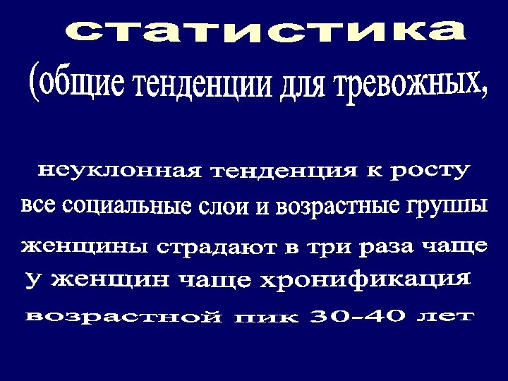 Клинические проявления тревожных расстройств Соматические (вегетативные) симптомы ü ü ü ü учащенное сердцебиение приливы жара или холода потливость, холодные и влажные ладони ощущение «кома» в горле чувство нехватки воздуха боли в груди тошнота, понос, боли в животе сухость во рту головокружение, предобморочное состояние тремор, подергивания мышц, вздрагивания напряжение и боль в мышцах учащенное мочеиспускание снижение либидо, импотенция.