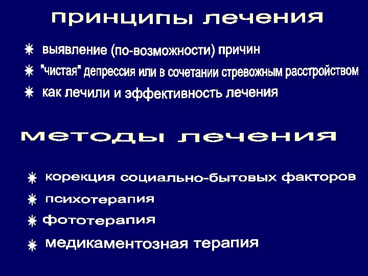 Терапия депрессий • Депрессия это болезнь, которую всегда необходимо лечить, вне зависимости от возраста пациента , сопутствующих заболеваний и причин депрессии. • Эффект антидепрессантов в пожилом возрасте наступает не ранее 6 -8 недель терапии.