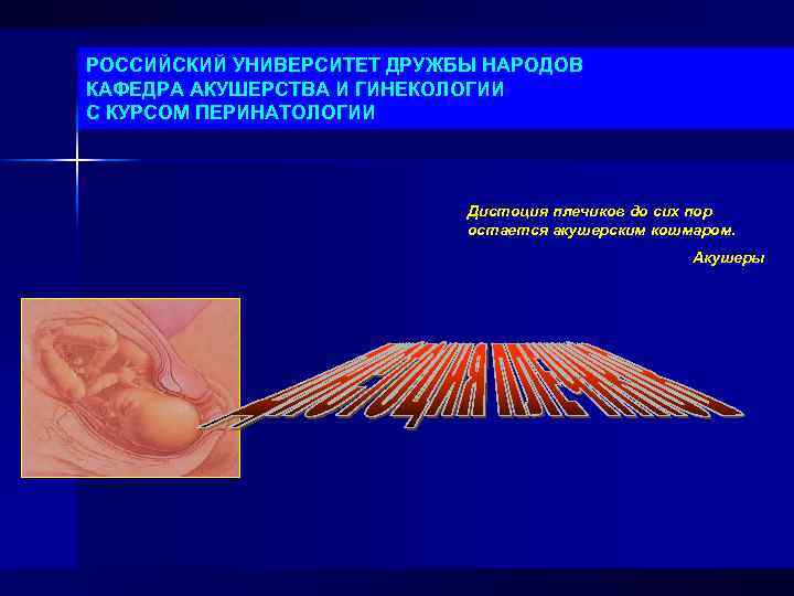 РОССИЙСКИЙ УНИВЕРСИТЕТ ДРУЖБЫ НАРОДОВ КАФЕДРА АКУШЕРСТВА И ГИНЕКОЛОГИИ С КУРСОМ ПЕРИНАТОЛОГИИ Дистоция плечиков до сих пор остается акушерским кошмаром. Акушеры