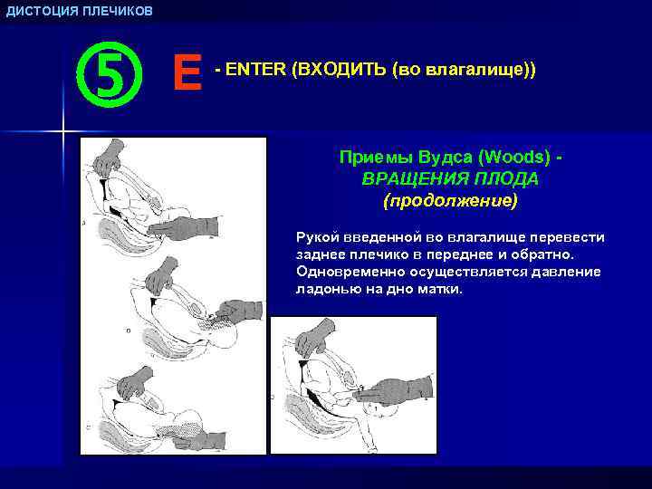 ДИСТОЦИЯ ПЛЕЧИКОВ E - ENTER (ВХОДИТЬ (во влагалище)) Приемы Вудса (Woods) - ВРАЩЕНИЯ ПЛОДА Рукой введенной во влагалище перевести заднее плечико в переднее (при этом переднее плечико, вращаясь по спирали на 180°, соскальзывает из под лона). Одновременно осуществляется давление ладонью на дно матки.