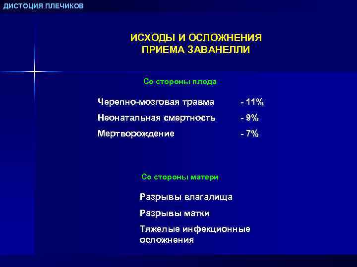 ДИСТОЦИЯ ПЛЕЧИКОВ ИСХОДЫ И ОСЛОЖНЕНИЯ ПРИЕМА ЗАВАНЕЛЛИ Со стороны плода Черепно-мозговая травма - 11% Неонатальная смертность - 9% Мертворождение - 7% Со стороны матери Разрывы влагалища Разрывы матки Тяжелые инфекционные осложнения