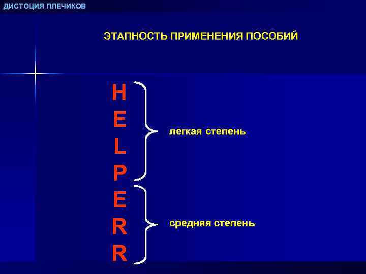 ДИСТОЦИЯ ПЛЕЧИКОВ ТЕРМИНОЛОГИЯ ВЫСОКАЯ ДИСТОЦИЯ ПЛЕЧИКОВ – задержка рождения обоих плечиков (двусторонняя дистоция плечиков). НИЗКАЯ ДИСТОЦИЯ ПЛЕЧИКОВ – задержка рождения одного плечика (переднего).