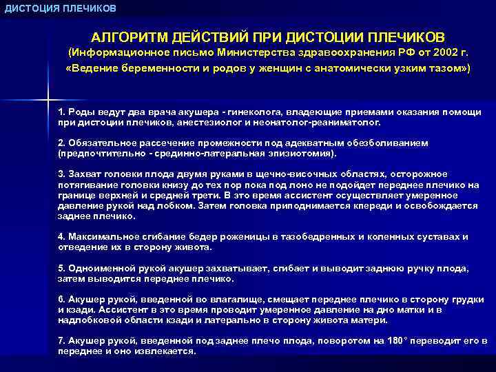 ДИСТОЦИЯ ПЛЕЧИКОВ АЛГОРИТМ ДЕЙСТВИЙ ПРИ ДИСТОЦИИ ПЛЕЧИКОВ (Информационное письмо Министерства здравоохранения РФ от 2002 г. «Ведение беременности и родов у женщин с анатомически узким тазом» ) 1. Роды ведут два врача акушера - гинеколога, владеющие приемами оказания помощи при дистоции плечиков, анестезиолог и неонатолог-реаниматолог. 2. Обязательное рассечение промежности под адекватным обезболиванием (предпочтительно - срединно-латеральная эпизиотомия). 3. Захват головки плода двумя руками в щечно-височных областях, осторожное потягивание головки книзу до тех пор пока под лоно не подойдет переднее плечико на границе верхней и средней трети. В это время ассистент осуществляет умеренное давление рукой над лобком. Затем головка приподнимается кпереди и освобождается заднее плечико. 4. Максимальное сгибание бедер роженицы в тазобедренных и коленных суставах и отведение их в сторону живота. 5. Одноименной рукой акушер захватывает, сгибает и выводит заднюю ручку плода, затем выводится переднее плечико. 6. Акушер рукой, введенной во влагалище, смещает переднее плечико в сторону грудки и кзади. Ассистент в это время проводит умеренное давление на дно матки и в надлобковой области кзади и латерально в сторону живота матери. 7. Акушер рукой, введенной под заднее плечо плода, поворотом на 180 ° переводит его в переднее и оно извлекается.