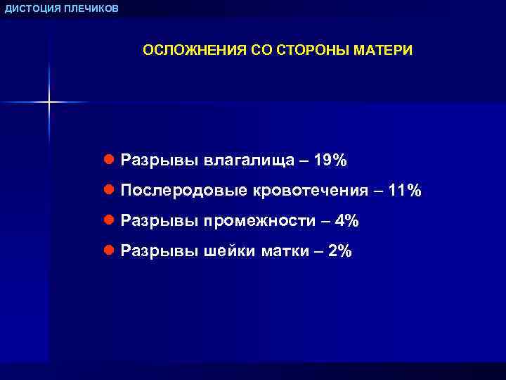 ДИСТОЦИЯ ПЛЕЧИКОВ ОСЛОЖНЕНИЯ СО СТОРОНЫ МАТЕРИ l Разрывы влагалища – 19% l Послеродовые кровотечения – 11% l Разрывы промежности – 4% l Разрывы шейки матки – 2%