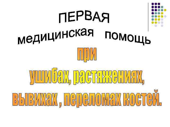 Первая помощь при растяжениях и разрывах связок. l l l Признаками травмы служат: Резкая боль (в первый момент). Припухлость. Кровоподтек и болезненность движений в суставе. На область поврежденной связки сначала накладывается холод, а затем тугая фиксирующая повязка, желательно эластичным бинтом. При значительном растяжении связок голеностопного или коленного суставов рекомендуется шина. Внутрь дается анальгин или амидопирин.