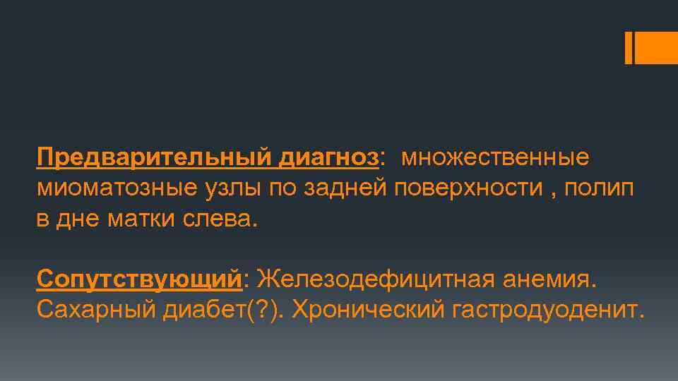 Предварительный диагноз: множественные миоматозные узлы по задней поверхности , полип в дне матки слева. Сопутствующий: Железодефицитная анемия. Сахарный диабет(? ). Хронический гастродуоденит.