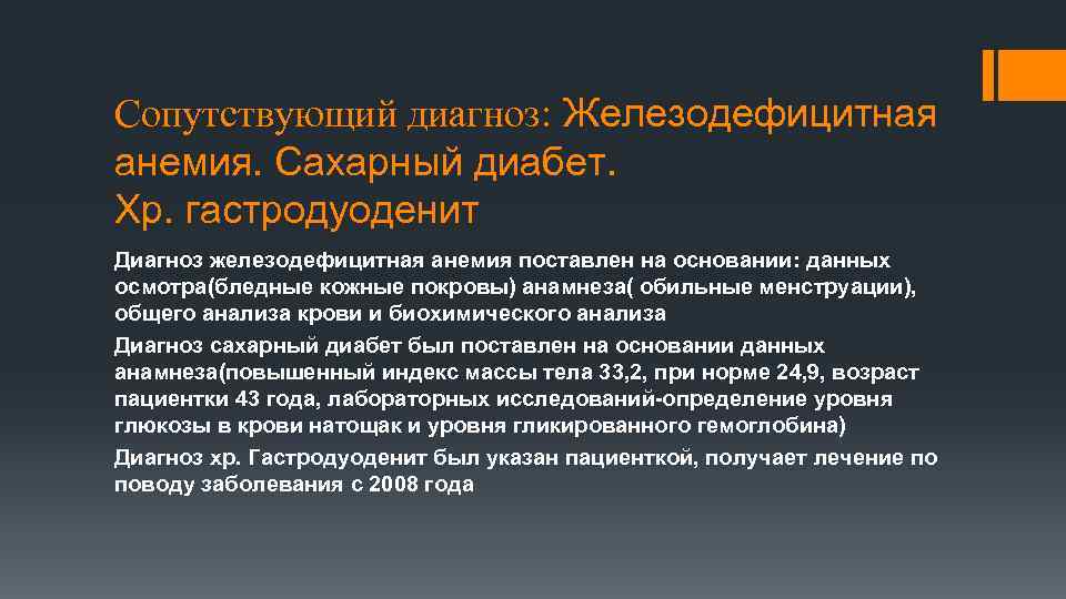 Сопутствующий диагноз: Железодефицитная анемия. Сахарный диабет. Хр. гастродуоденит Диагноз железодефицитная анемия поставлен на основании: данных осмотра(бледные кожные покровы) анамнеза( обильные менструации), общего анализа крови и биохимического анализа Диагноз сахарный диабет был поставлен на основании данных анамнеза(повышенный индекс массы тела 33, 2, при норме 24, 9, возраст пациентки 43 года, лабораторных исследований-определение уровня глюкозы в крови натощак и уровня гликированного гемоглобина) Диагноз хр. Гастродуоденит был указан пациенткой, получает лечение по поводу заболевания с 2008 года