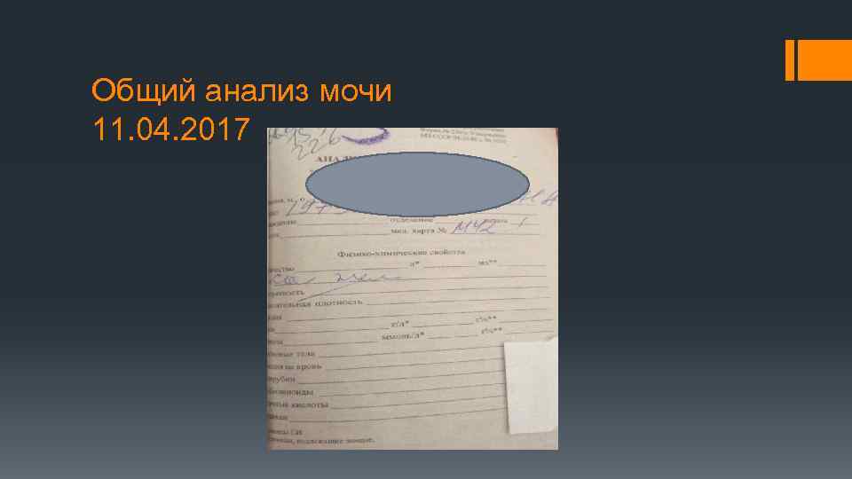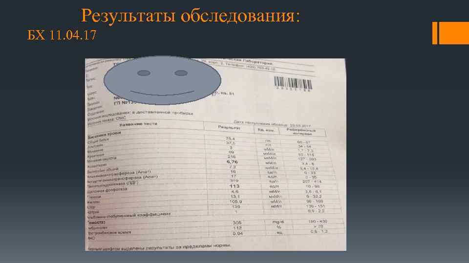 11. 04. 17. ОАК: § Лейкоциты-6, 8 х10^9/л § Эритроциты-3, 2 х10^12/л § Hb- 90 г/л § Гематокрит- 0, 34 § Тромбоциты- 190 х10^9/л Протромбиновый время- 13 сек. Протромбин- 0, 13 г/л Протромбиновый индекс- 95% Уровень гликированного Hb- 12% (при норме до 5, 8) Уровнь сахара в крови-13, 4 ммоль/л Группа крови: III(B), резус принадлежность – (RH-). АТ к TR. pallidum, ВИЧ, HCV не обнаружено.