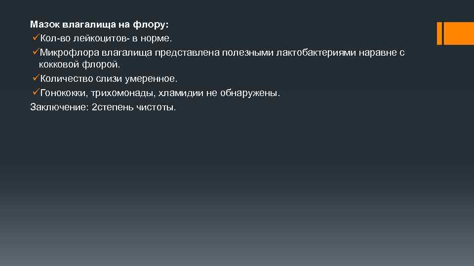 Мазок влагалища на флору: üКол-во лейкоцитов- в норме. üМикрофлора влагалища представлена полезными лактобактериями наравне с кокковой флорой. üКоличество слизи умеренное. üГонококки, трихомонады, хламидии не обнаружены. Заключение: 2 степень чистоты.