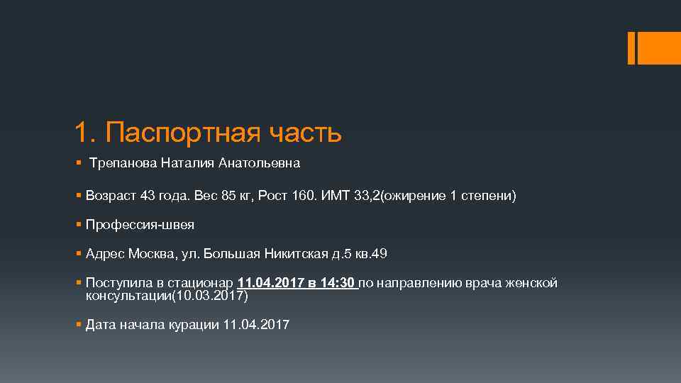 1. Паспортная часть § Трепанова Наталия Анатольевна § Возраст 43 года. Вес 85 кг, Рост 160. ИМТ 33, 2(ожирение 1 степени) § Профессия-швея § Адрес Москва, ул. Большая Никитская д. 5 кв. 49 § Поступила в стационар 11. 04. 2017 в 14: 30 по направлению врача женской консультации(10. 03. 2017) § Дата начала курации 11. 04. 2017