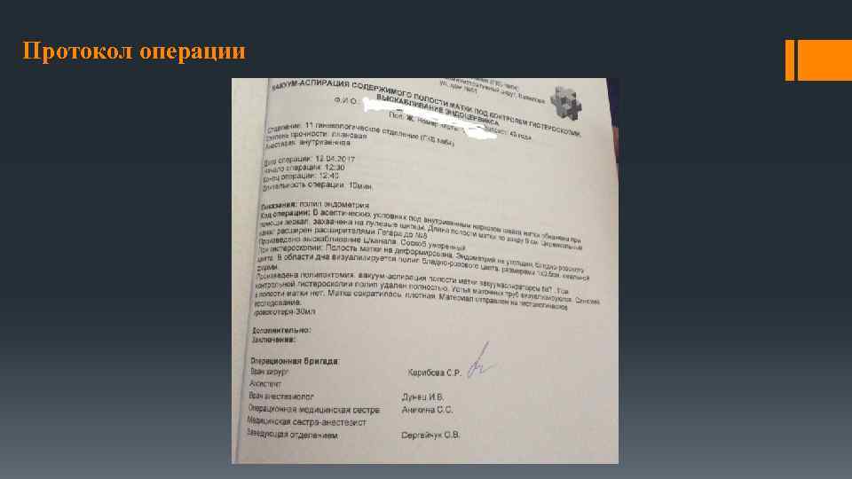 План лечения: Операция на 12. 04. 2017: вакуум-аспирация содержимого полости матки под контролем гистероскопии. Выскабливание эндоцервикса. Медикаментозное лечение Цефтриаксон-2. 0 в/м 2/сут ( курс 7 дней) Глюкофаж-500 мг во время еды Фенюльс- 1 капсула 1 р/сут ( курс 1 месяц)