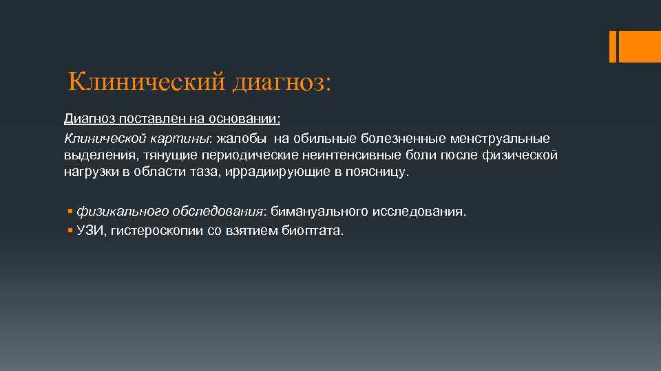 Клинический диагноз: Диагноз поставлен на основании: Клинической картины: жалобы на обильные болезненные менструальные выделения, тянущие периодические неинтенсивные боли после физической нагрузки в области таза, иррадиирующие в поясницу. § физикального обследования: бимануального исследования. § УЗИ, гистероскопии со взятием биоптата.