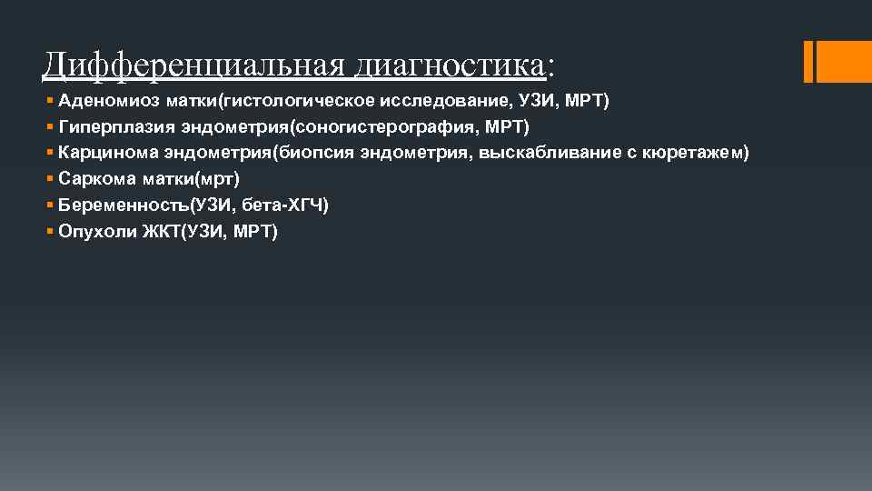 Дифференциальная диагностика: § Аденомиоз матки(гистологическое исследование, УЗИ, МРТ) § Гиперплазия эндометрия(соногистерография, МРТ) § Карцинома эндометрия(биопсия эндометрия, выскабливание с кюретажем) § Саркома матки(мрт) § Беременность(УЗИ, бета-ХГЧ) § Опухоли ЖКТ(УЗИ, МРТ)