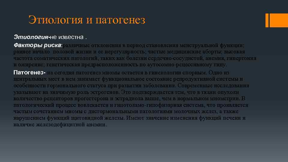 Этиология и патогенез Этиология-не известна. Факторы риска: различные отклонения в период становления менструальной функции; раннее начало половой жизни и ее нерегулярность; частые медицинские аборты; высокая частота соматических патологий, таких как болезни сердечно-сосудистой, анемия, гипертония и ожирение; генетическая предрасположенность по аутосомно-рецессивному типу. Патогенез- на сегодня патогенез миомы остается в гинекологии спорным. Одно из центральных мест в нем занимает функциональное состояние репродуктивной системы и особенности гормонального статуса при развитии заболевания. Современные исследования указывают на значимую роль эстрогенов. Это подтверждается тем, что в ткани опухоли количество рецепторов прогестерона и эстрадиола выше, чем в нормальном миометрии. В патологический процесс вовлекается и гипотоламо-гипофизарная система, что проявляется частым сочетанием миомы с дисгормональными патологиями молочных желез, а также нарушением функций щитовидной железы. Имеют значение изменения функций печени и наличие железодефицитной анемии.
