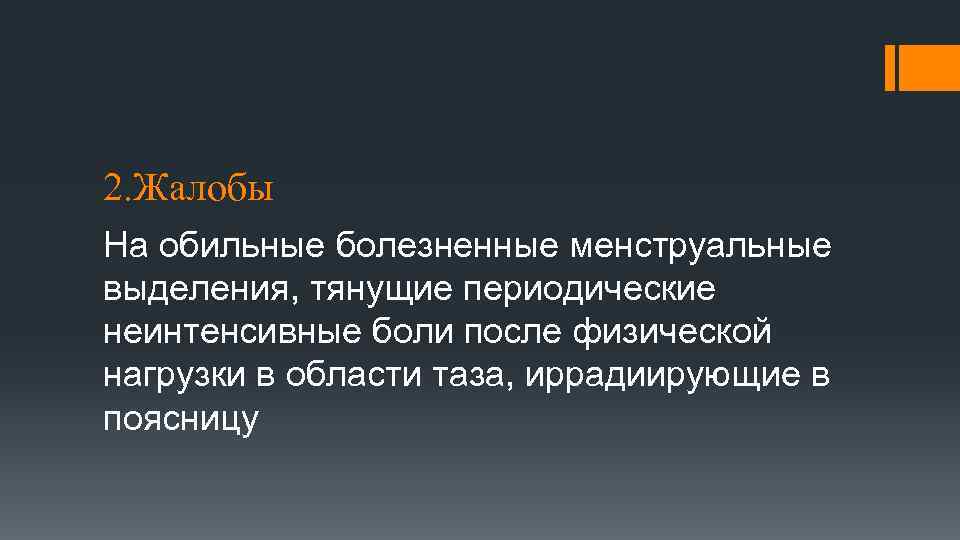 2. Жалобы На обильные болезненные менструальные выделения, тянущие периодические неинтенсивные боли после физической нагрузки в области таза, иррадиирующие в поясницу