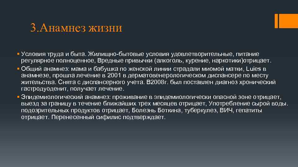 3. Анамнез жизни § Условия труда и быта. Жилищно-бытовые условия удовлетворительные, питание регулярное полноценное, Вредные привычки (алкоголь, курение, наркотики)отрицает. § Общий анамнез: мама и бабушка по женской линии страдали миомой матки, Luies в анамнезе, прошла лечение в 2001 в дерматовенерологическом диспансере по месту жительства. Снята с диспансерного учета. В 2008 г. был поставлен диагноз хронический гастродуоденит, получает лечение. § Эпидемиологический анамнез: проживание в эпидемиологически опасной зоне отрицает, выезд за границу в течение ближайших трех месяцев отрицает, Употребление сырой воды. подозрительных продуктов отрицает, Болезнь Боткина, туберкулез, ВИЧ, гепатиты отрицает. Перенесенный сифилис подтверждает.