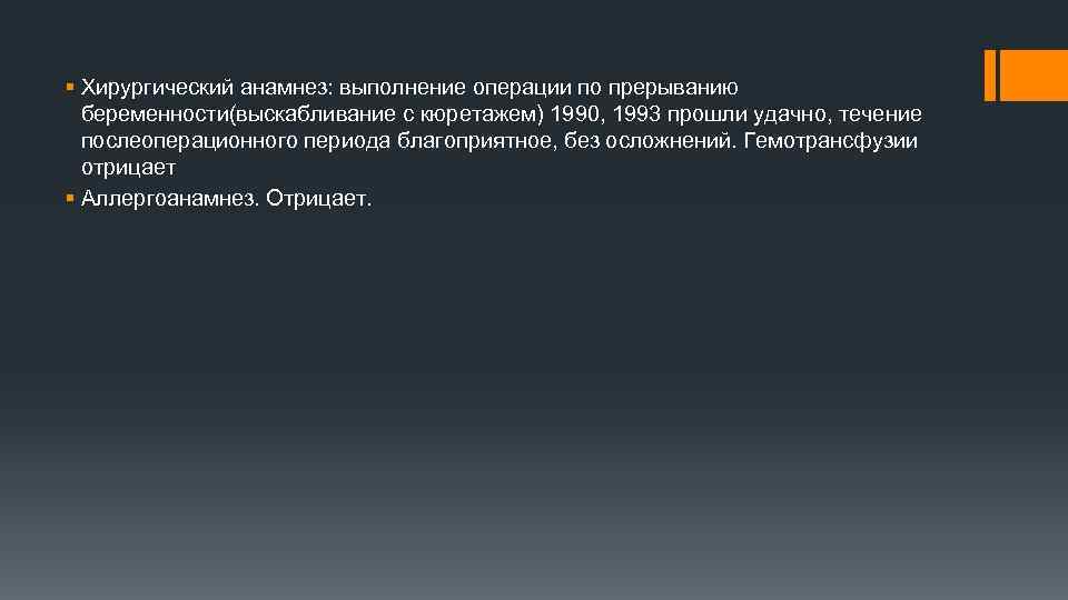 § Хирургический анамнез: выполнение операции по прерыванию беременности(выскабливание с кюретажем) 1990, 1993 прошли удачно, течение послеоперационного периода благоприятное, без осложнений. Гемотрансфузии отрицает § Аллергоанамнез. Отрицает.