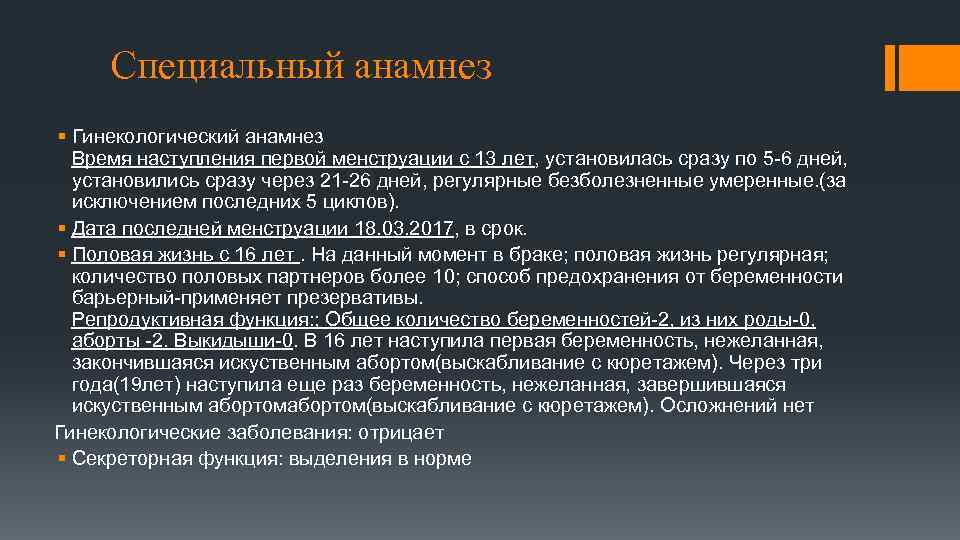 Специальный анамнез § Гинекологический анамнез Время наступления первой менструации с 13 лет, установилась сразу по 5 -6 дней, установились сразу через 21 -26 дней, регулярные безболезненные умеренные. (за исключением последних 5 циклов). § Дата последней менструации 18. 03. 2017, в срок. § Половая жизнь с 16 лет. На данный момент в браке; половая жизнь регулярная; количество половых партнеров более 10; способ предохранения от беременности барьерный-применяет презервативы. Репродуктивная функция: ; Общее количество беременностей-2, из них роды-0, аборты -2. Выкидыши-0. В 16 лет наступила первая беременность, нежеланная, закончившаяся искуственным абортом(выскабливание с кюретажем). Через три года(19 лет) наступила еще раз беременность, нежеланная, завершившаяся искуственным абортом(выскабливание с кюретажем). Осложнений нет Гинекологические заболевания: отрицает § Секреторная функция: выделения в норме