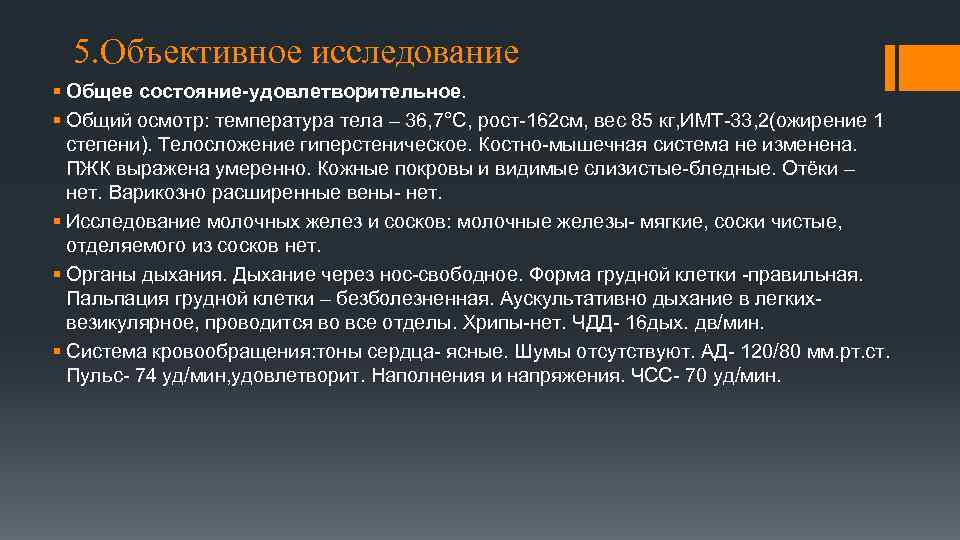 5. Объективное исследование § Общее состояние-удовлетворительное. § Общий осмотр: температура тела – 36, 7°С, рост-162 см, вес 85 кг, ИМТ-33, 2(ожирение 1 степени). Телосложение гиперстеническое. Костно-мышечная система не изменена. ПЖК выражена умеренно. Кожные покровы и видимые слизистые-бледные. Отёки – нет. Варикозно расширенные вены- нет. § Исследование молочных желез и сосков: молочные железы- мягкие, соски чистые, отделяемого из сосков нет. § Органы дыхания. Дыхание через нос-свободное. Форма грудной клетки -правильная. Пальпация грудной клетки – безболезненная. Аускультативно дыхание в легкихвезикулярное, проводится во все отделы. Хрипы-нет. ЧДД- 16 дых. дв/мин. § Система кровообращения: тоны сердца- ясные. Шумы отсутствуют. АД- 120/80 мм. рт. ст. Пульс- 74 уд/мин, удовлетворит. Наполнения и напряжения. ЧСС- 70 уд/мин.