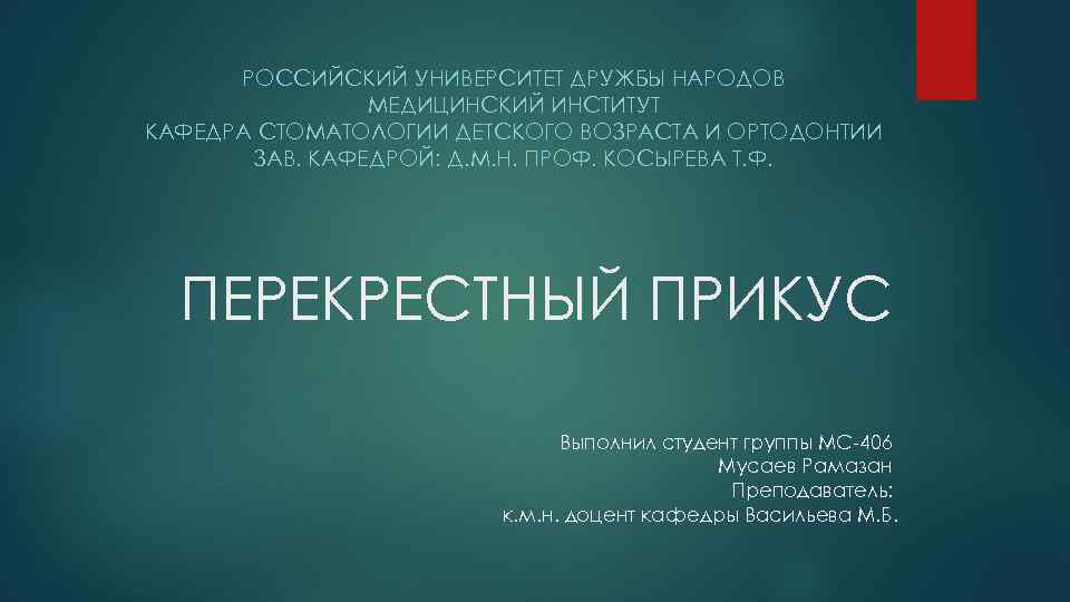 РОССИЙСКИЙ УНИВЕРСИТЕТ ДРУЖБЫ НАРОДОВ МЕДИЦИНСКИЙ ИНСТИТУТ КАФЕДРА СТОМАТОЛОГИИ ДЕТСКОГО ВОЗРАСТА И ОРТОДОНТИИ ЗАВ. КАФЕДРОЙ: Д. М. Н. ПРОФ. КОСЫРЕВА Т. Ф. ПЕРЕКРЕСТНЫЙ ПРИКУС Выполнил студент группы МС-406 Мусаев Рамазан Преподаватель: к. м. н. доцент кафедры Васильева М. Б.