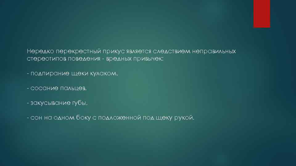 Нередко перекрестный прикус является следствием неправильных стереотипов поведения - вредных привычек: - подпирание щеки кулаком, - сосание пальцев, - закусывание губы, - сон на одном боку с подложенной под щеку рукой.