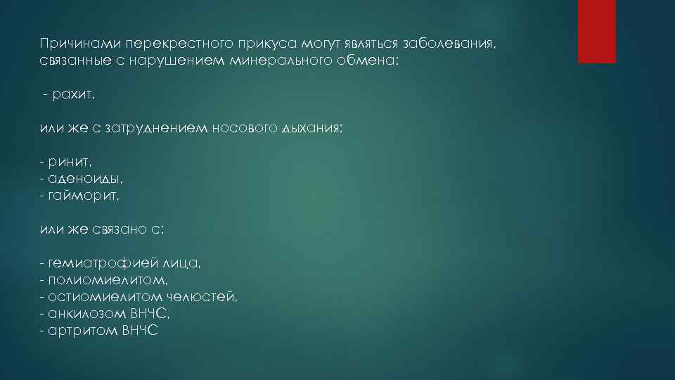 Причинами перекрестного прикуса могут являться заболевания, связанные с нарушением минерального обмена: - рахит, или же с затруднением носового дыхания: - ринит, - аденоиды, - гайморит, или же связано с: - гемиатрофией лица, - полиомиелитом, - остиомиелитом челюстей, - анкилозом ВНЧС, - артритом ВНЧС