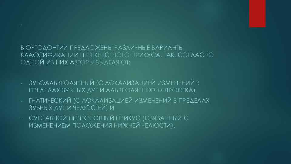 . В ОРТОДОНТИИ ПРЕДЛОЖЕНЫ РАЗЛИЧНЫЕ ВАРИАНТЫ КЛАССИФИКАЦИИ ПЕРЕКРЕСТНОГО ПРИКУСА. ТАК, СОГЛАСНО ОДНОЙ ИЗ НИХ АВТОРЫ ВЫДЕЛЯЮТ: - ЗУБОАЛЬВЕОЛЯРНЫЙ (С ЛОКАЛИЗАЦИЕЙ ИЗМЕНЕНИЙ В ПРЕДЕЛАХ ЗУБНЫХ ДУГ И АЛЬВЕОЛЯРНОГО ОТРОСТКА), - ГНАТИЧЕСКИЙ (С ЛОКАЛИЗАЦИЕЙ ИЗМЕНЕНИЙ В ПРЕДЕЛАХ ЗУБНЫХ ДУГ И ЧЕЛЮСТЕЙ) И - СУСТАВНОЙ ПЕРЕКРЕСТНЫЙ ПРИКУС (СВЯЗАННЫЙ С ИЗМЕНЕНИЕМ ПОЛОЖЕНИЯ НИЖНЕЙ ЧЕЛЮСТИ).
