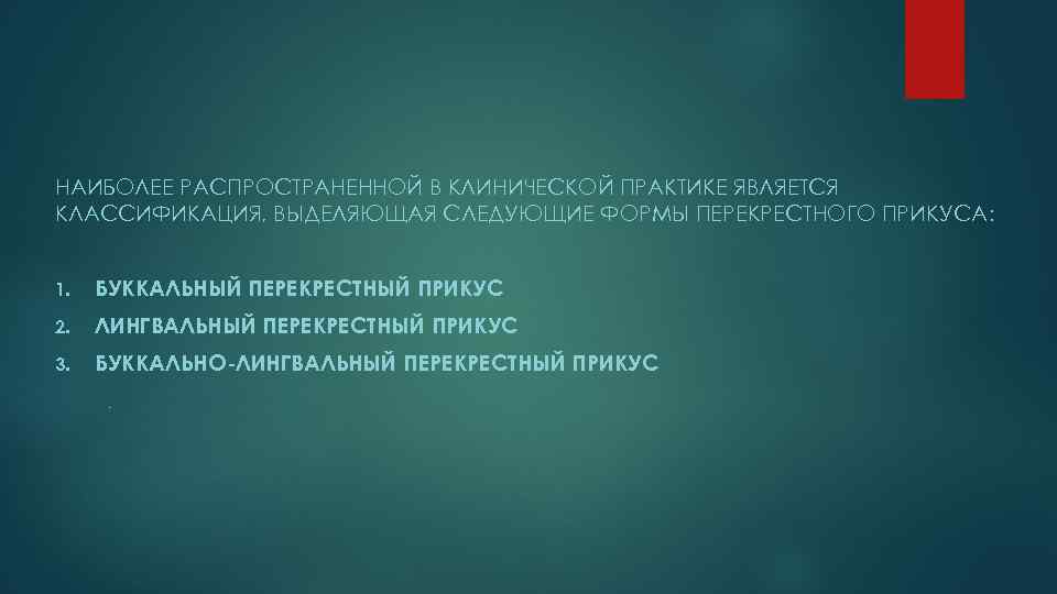 НАИБОЛЕЕ РАСПРОСТРАНЕННОЙ В КЛИНИЧЕСКОЙ ПРАКТИКЕ ЯВЛЯЕТСЯ КЛАССИФИКАЦИЯ, ВЫДЕЛЯЮЩАЯ СЛЕДУЮЩИЕ ФОРМЫ ПЕРЕКРЕСТНОГО ПРИКУСА: 1. БУККАЛЬНЫЙ ПЕРЕКРЕСТНЫЙ ПРИКУС 2. ЛИНГВАЛЬНЫЙ ПЕРЕКРЕСТНЫЙ ПРИКУС 3. БУККАЛЬНО-ЛИНГВАЛЬНЫЙ ПЕРЕКРЕСТНЫЙ ПРИКУС .
