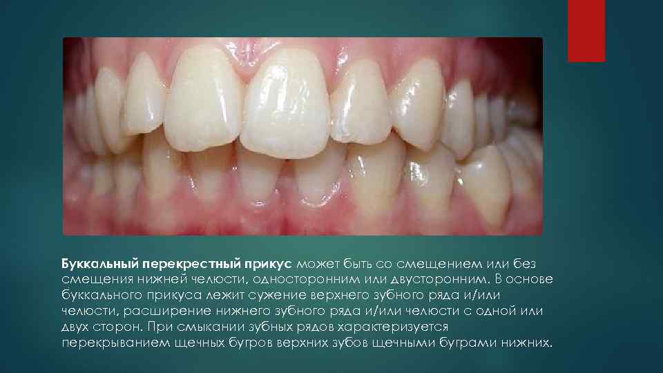 Буккальный перекрестный прикус может быть со смещением или без смещения нижней челюсти, односторонним или двусторонним. В основе. буккального прикуса лежит сужение верхнего зубного ряда и/или челюсти, расширение нижнего зубного ряда и/или челюсти с одной или двух сторон. При смыкании зубных рядов характеризуется перекрыванием щечных бугров верхних зубов щечными буграми нижних.