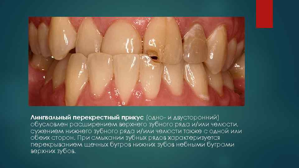 Лингвальный перекрестный прикус (одно- и двусторонний) обусловлен расширением верхнего зубного ряда и/или челюсти, сужением нижнего зубного ряда и/или челюсти также с одной или обеих сторон. При смыкании зубных рядов характеризуется перекрыванием щечных бугров нижних зубов небными буграми верхних зубов. .
