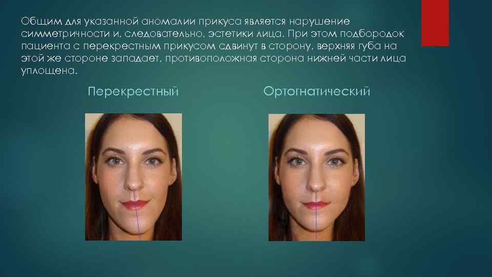 Общим для указанной аномалии прикуса является нарушение симметричности и, следовательно, эстетики лица. При этом подбородок пациента с перекрестным прикусом сдвинут в сторону, верхняя губа на этой же стороне западает, противоположная сторона нижней части лица уплощена. Перекрестный Ортогнатический