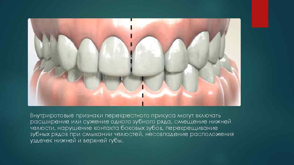 Внутриротовые признаки перекрестного прикуса могут включать расширение или сужение одного зубного ряда, смещение нижней. челюсти, нарушение контакта боковых зубов, перекрещивание зубных рядов при смыкании челюстей, несовпадение расположения уздечек нижней и верхней губы.
