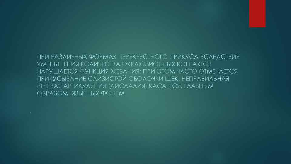 ПРИ РАЗЛИЧНЫХ ФОРМАХ ПЕРЕКРЕСТНОГО ПРИКУСА ВСЛЕДСТВИЕ УМЕНЬШЕНИЯ КОЛИЧЕСТВА ОККЛЮЗИОННЫХ КОНТАКТОВ НАРУШАЕТСЯ ФУНКЦИЯ ЖЕВАНИЯ; ПРИ ЭТОМ ЧАСТО ОТМЕЧАЕТСЯ ПРИКУСЫВАНИЕ СЛИЗИСТОЙ ОБОЛОЧКИ ЩЕК. НЕПРАВИЛЬНАЯ РЕЧЕВАЯ АРТИКУЛЯЦИЯ (ДИСЛАЛИЯ) КАСАЕТСЯ, ГЛАВНЫМ ОБРАЗОМ, ЯЗЫЧНЫХ ФОНЕМ. .