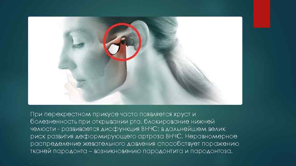 При перекрестном прикусе часто появляется хруст и болезненность при открывании рта, блокирование нижней челюсти - развивается дисфункция ВНЧС; в дальнейшем велик риск развития деформирующего артроза ВНЧС. Неравномерное распределение жевательного давления способствует поражению тканей пародонта – возникновению пародонтита и пародонтоза. .