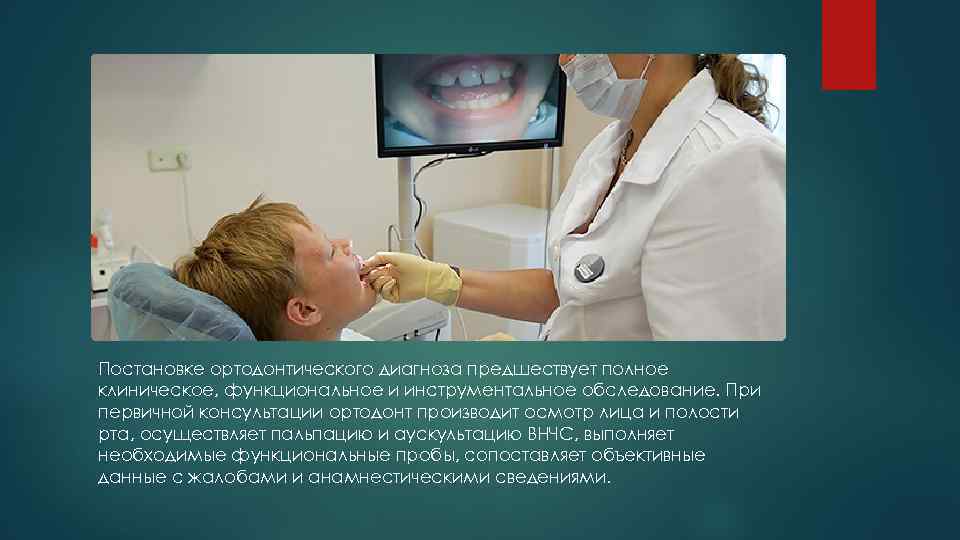 Постановке ортодонтического диагноза предшествует полное клиническое, функциональное и инструментальное обследование. При. первичной консультации ортодонт производит осмотр лица и полости рта, осуществляет пальпацию и аускультацию ВНЧС, выполняет необходимые функциональные пробы, сопоставляет объективные данные с жалобами и анамнестическими сведениями.