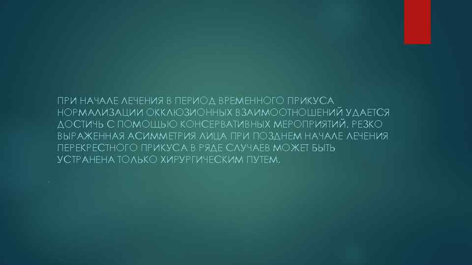 ПРИ НАЧАЛЕ ЛЕЧЕНИЯ В ПЕРИОД ВРЕМЕННОГО ПРИКУСА НОРМАЛИЗАЦИИ ОККЛЮЗИОННЫХ ВЗАИМООТНОШЕНИЙ УДАЕТСЯ ДОСТИЧЬ С ПОМОЩЬЮ КОНСЕРВАТИВНЫХ МЕРОПРИЯТИЙ. РЕЗКО ВЫРАЖЕННАЯ АСИММЕТРИЯ ЛИЦА ПРИ ПОЗДНЕМ НАЧАЛЕ ЛЕЧЕНИЯ ПЕРЕКРЕСТНОГО ПРИКУСА В РЯДЕ СЛУЧАЕВ МОЖЕТ БЫТЬ УСТРАНЕНА ТОЛЬКО ХИРУРГИЧЕСКИМ ПУТЕМ. .