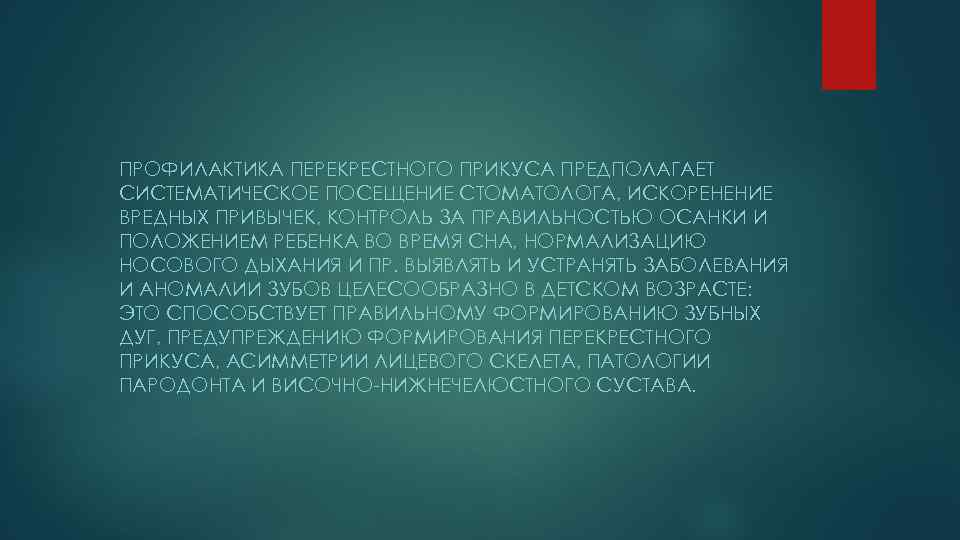 ПРОФИЛАКТИКА ПЕРЕКРЕСТНОГО ПРИКУСА ПРЕДПОЛАГАЕТ СИСТЕМАТИЧЕСКОЕ ПОСЕЩЕНИЕ СТОМАТОЛОГА, ИСКОРЕНЕНИЕ ВРЕДНЫХ ПРИВЫЧЕК, КОНТРОЛЬ ЗА ПРАВИЛЬНОСТЬЮ ОСАНКИ И ПОЛОЖЕНИЕМ РЕБЕНКА ВО ВРЕМЯ СНА, НОРМАЛИЗАЦИЮ НОСОВОГО ДЫХАНИЯ И ПР. ВЫЯВЛЯТЬ И УСТРАНЯТЬ ЗАБОЛЕВАНИЯ И АНОМАЛИИ ЗУБОВ ЦЕЛЕСООБРАЗНО В ДЕТСКОМ ВОЗРАСТЕ: ЭТО СПОСОБСТВУЕТ ПРАВИЛЬНОМУ ФОРМИРОВАНИЮ ЗУБНЫХ ДУГ, ПРЕДУПРЕЖДЕНИЮ ФОРМИРОВАНИЯ ПЕРЕКРЕСТНОГО ПРИКУСА, АСИММЕТРИИ ЛИЦЕВОГО СКЕЛЕТА, ПАТОЛОГИИ ПАРОДОНТА И ВИСОЧНО-НИЖНЕЧЕЛЮСТНОГО СУСТАВА. .