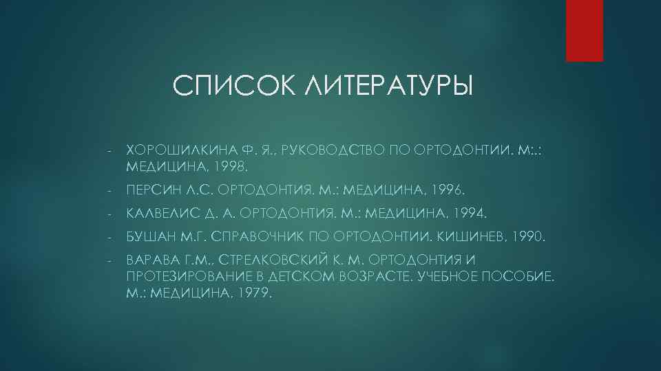 СПИСОК ЛИТЕРАТУРЫ - ХОРОШИЛКИНА Ф. Я. , РУКОВОДСТВО ПО ОРТОДОНТИИ. М: . : МЕДИЦИНА, 1998. - ПЕРСИН Л. С. ОРТОДОНТИЯ. М. : МЕДИЦИНА, 1996. - КАЛВЕЛИС Д. А. ОРТОДОНТИЯ. М. : МЕДИЦИНА, 1994. - БУШАН М. Г. СПРАВОЧНИК ПО ОРТОДОНТИИ. КИШИНЕВ, 1990. - ВАРАВА Г. М. , СТРЕЛКОВСКИЙ К. М. ОРТОДОНТИЯ И ПРОТЕЗИРОВАНИЕ В ДЕТСКОМ ВОЗРАСТЕ. УЧЕБНОЕ ПОСОБИЕ. М. : МЕДИЦИНА, 1979.