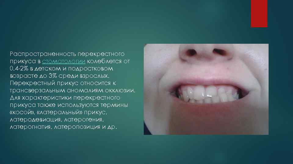 Распространенность перекрестного прикуса в стоматологии колеблется от 0, 4 -2% в детском и подростковом возрасте до 3% среди взрослых. Перекрестный прикус относится к трансверзальным аномалиям окклюзии. Для характеристики перекрестного прикуса также используются термины «косой» , «латеральный» прикус, латеродевиация, латерогения, латерогнатия, латеропозиция и др. .