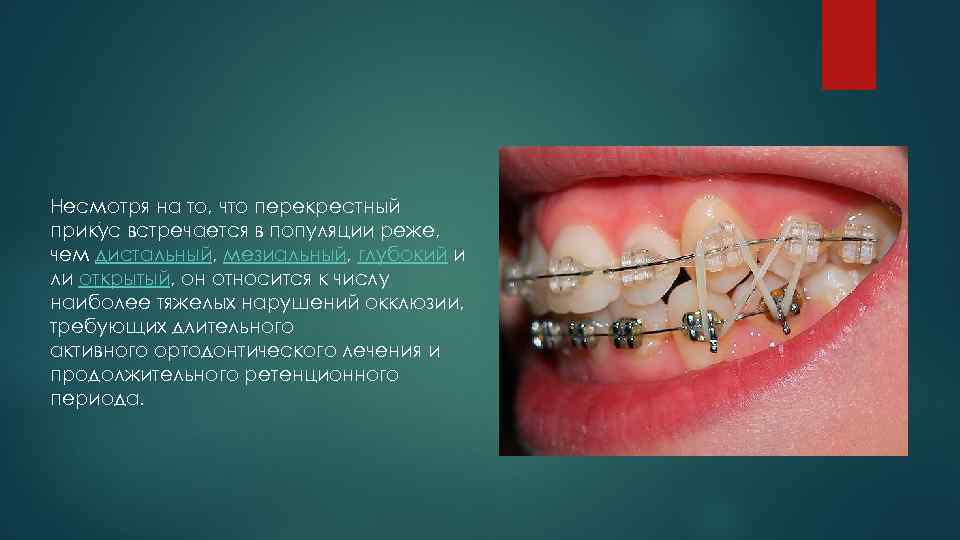 Несмотря на то, что перекрестный прикус встречается в популяции реже, чем дистальный, мезиальный, глубокий и ли открытый, он относится к числу наиболее тяжелых нарушений окклюзии, требующих длительного активного ортодонтического лечения и продолжительного ретенционного периода. .