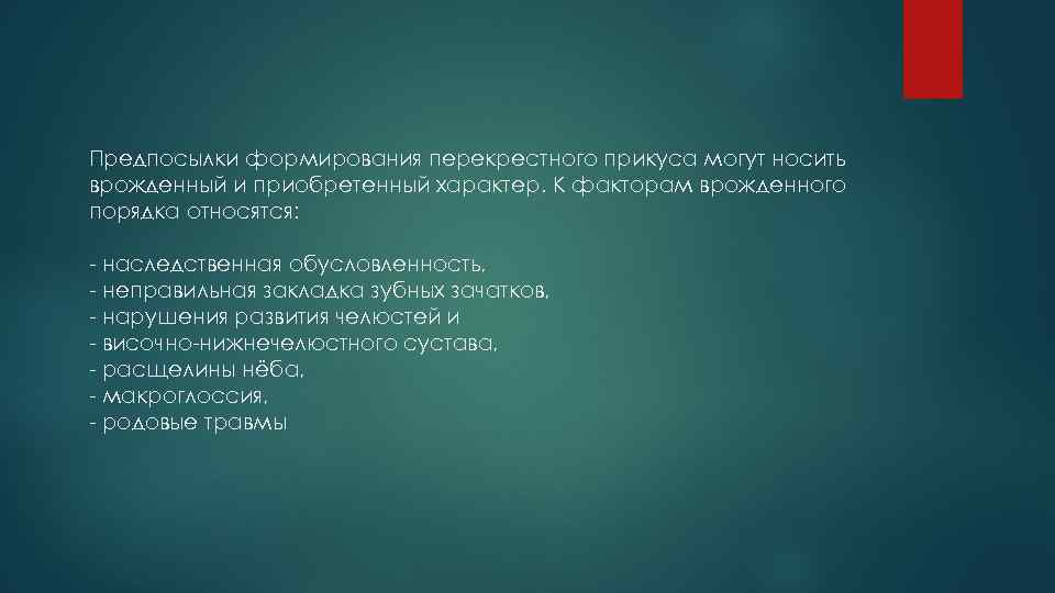 Предпосылки формирования перекрестного прикуса могут носить врожденный и приобретенный характер. К факторам врожденного порядка относятся: - наследственная обусловленность, - неправильная закладка зубных зачатков, - нарушения развития челюстей и - височно-нижнечелюстного сустава, - расщелины нёба, - макроглоссия, - родовые травмы