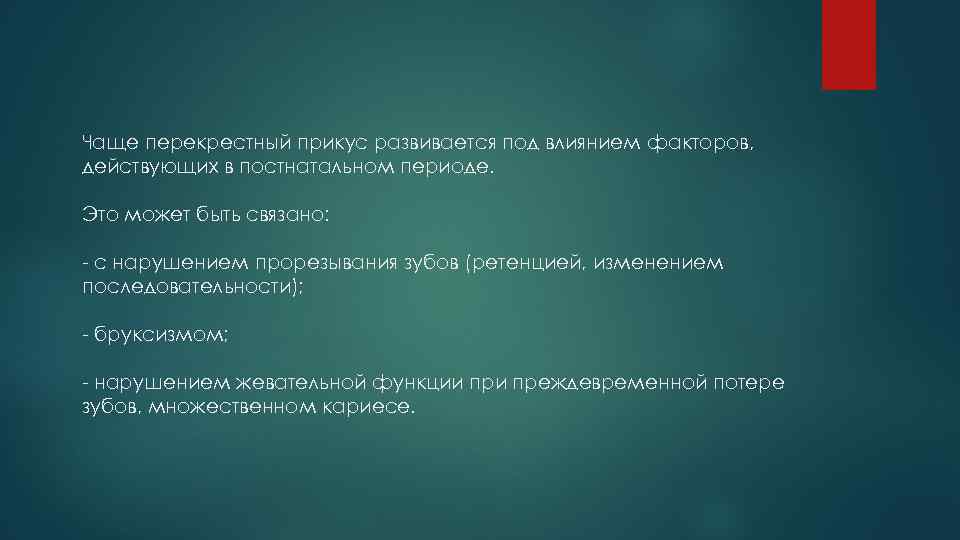Чаще перекрестный прикус развивается под влиянием факторов, действующих в постнатальном периоде. Это может быть связано: - с нарушением прорезывания зубов (ретенцией, изменением последовательности); - бруксизмом; - нарушением жевательной функции преждевременной потере зубов, множественном кариесе.