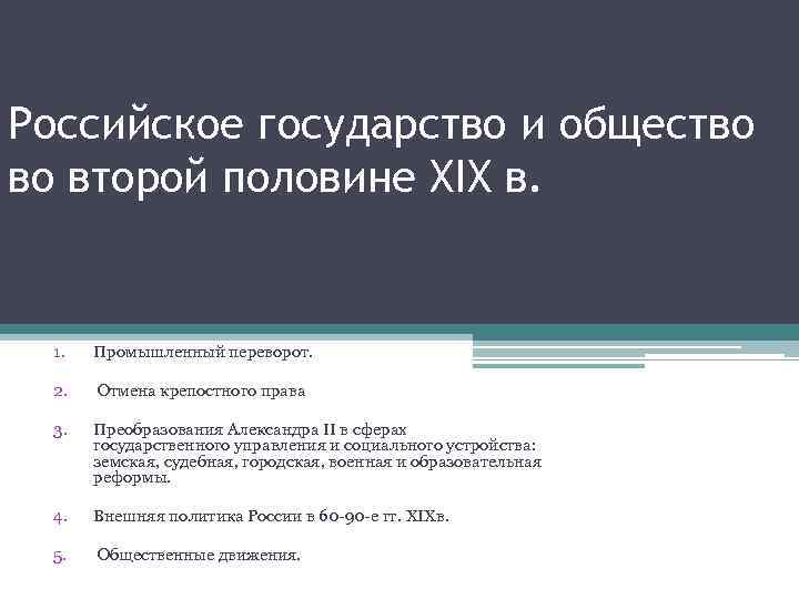 Российское государство и общество во второй половине XIX в. 1. Промышленный переворот. 2. Отмена крепостного права 3. Преобразования Александра II в сферах государственного управления и социального устройства: земская, судебная, городская, военная и образовательная реформы. 4. Внешняя политика России в 60 -90 -е гг. XIXв. 5. Общественные движения.