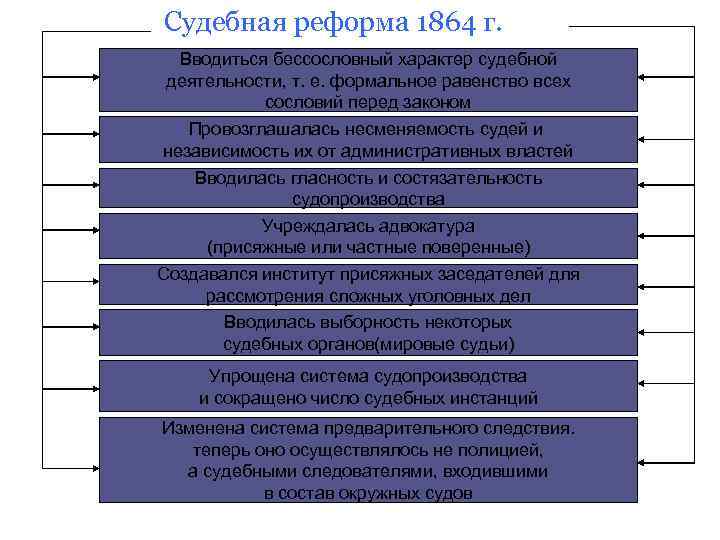 Судебная реформа 1864 г. Вводиться бессословный характер судебной деятельности, т. е. формальное равенство всех сословий перед законом Провозглашалась несменяемость судей и независимость их от административных властей Вводилась гласность и состязательность судопроизводства Учреждалась адвокатура (присяжные или частные поверенные) Создавался институт присяжных заседателей для рассмотрения сложных уголовных дел Вводилась выборность некоторых судебных органов(мировые судьи) Упрощена система судопроизводства и сокращено число судебных инстанций Изменена система предварительного следствия. теперь оно осуществлялось не полицией, а судебными следователями, входившими в состав окружных судов