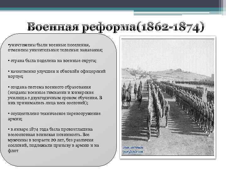 Военная реформа(1862 -1874) • уничтожены были военные поселения, отменены унизительные телесные наказания; • страна была поделена на военные округа; • качественно улучшен и обновлён офицерский корпус; • создана система военного образования (созданы военные гимназии и юнкерские училища с двухгодичным сроком обучения. В них принимались лица всех сословий); • осуществлено техническое перевооружение армии; • в январе 1874 года была провозглашена всесословная воинская повинность. Все мужчины в возрасте 20 лет, без различия сословий, подлежали призыву в армию и на флот