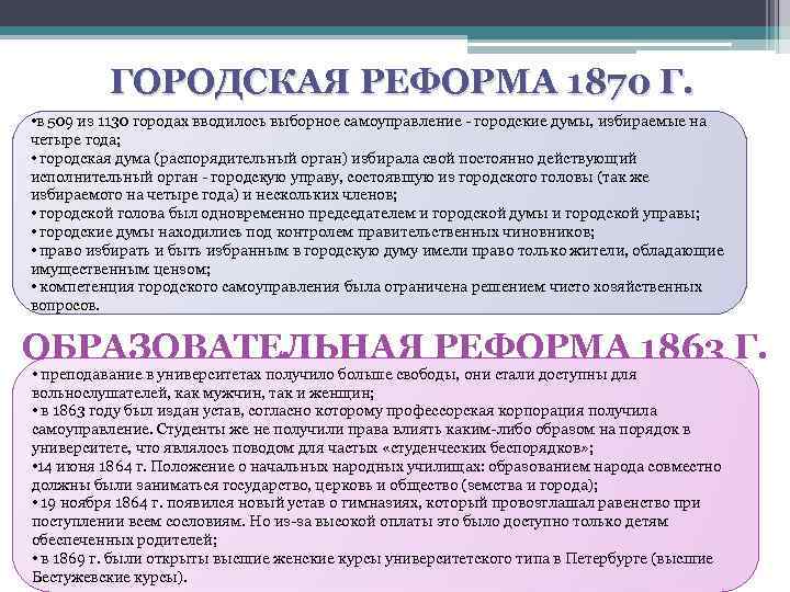 ГОРОДСКАЯ РЕФОРМА 1870 Г. • в 509 из 1130 городах вводилось выборное самоуправление - городские думы, избираемые на четыре года; • городская дума (распорядительный орган) избирала свой постоянно действующий исполнительный орган - городскую управу, состоявшую из городского головы (так же избираемого на четыре года) и нескольких членов; • городской голова был одновременно председателем и городской думы и городской управы; • городские думы находились под контролем правительственных чиновников; • право избирать и быть избранным в городскую думу имели право только жители, обладающие имущественным цензом; • компетенция городского самоуправления была ограничена решением чисто хозяйственных вопросов. ОБРАЗОВАТЕЛЬНАЯ РЕФОРМА 1863 Г. • преподавание в университетах получило больше свободы, они стали доступны для вольнослушателей, как мужчин, так и женщин; • в 1863 году был издан устав, согласно которому профессорская корпорация получила самоуправление. Студенты же не получили права влиять каким-либо образом на порядок в университете, что являлось поводом для частых «студенческих беспорядков» ; • 14 июня 1864 г. Положение о начальных народных училищах: образованием народа совместно должны были заниматься государство, церковь и общество (земства и города); • 19 ноября 1864 г. появился новый устав о гимназиях, который провозглашал равенство при поступлении всем сословиям. Но из-за высокой оплаты это было доступно только детям обеспеченных родителей; • в 1869 г. были открыты высшие женские курсы университетского типа в Петербурге (высшие Бестужевские курсы).