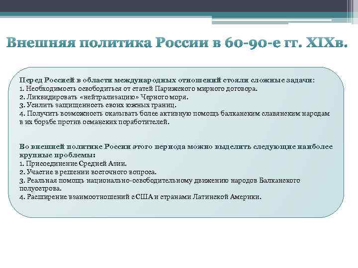 Внешняя политика России в 60 -90 -е гг. XIXв. Перед Россией в области международных отношений стояли сложные задачи: 1. Необходимость освободиться от статей Парижского мирного договора. 2. Ликвидировать «нейтрализацию» Черного моря. 3. Усилить защищенность своих южных границ. 4. Получить возможность оказывать более активную помощь балканским славянским народам в их борьбе против османских поработителей. Во внешней политике России этого периода можно выделить следующие наиболее крупные проблемы: 1. Присоединение Средней Азии. 2. Участие в решении восточного вопроса. 3. Реальная помощь национально-освободительному движению народов Балканского полуострова. 4. Расширение взаимоотношений с США и странами Латинской Америки.