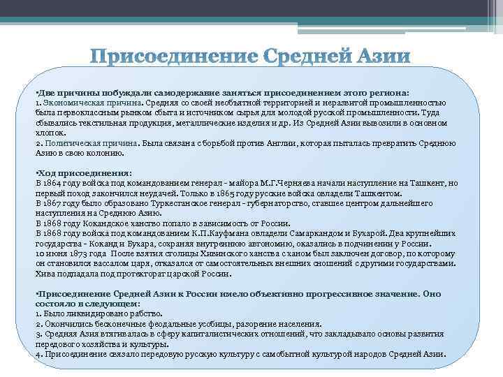 Присоединение Средней Азии • Две причины побуждали самодержавие заняться присоединением этого региона: 1. Экономическая причина. Средняя со своей необъятной территорией и неразвитой промышленностью была первоклассным рынком сбыта и источником сырья для молодой русской промышленности. Туда сбывались текстильная продукция, металлические изделия и др. Из Средней Азии вывозили в основном хлопок. 2. Политическая причина. Была связана с борьбой против Англии, которая пыталась превратить Среднюю Азию в свою колонию. • Ход присоединения: В 1864 году войска под командованием генерал - майора М. Г. Черняева начали наступление на Ташкент, но первый поход закончился неудачей. Только в 1865 году русские войска овладели Ташкентом. В 1867 году было образовано Туркестанское генерал - губернаторство, ставшее центром дальнейшего наступления на Среднюю Азию. В 1868 году Кокандское ханство попало в зависимость от России. В 1868 году войска под командованием К. П. Кауфмана овладели Самаркандом и Бухарой. Два крупнейших государства - Коканд и Бухара, сохраняя внутреннюю автономию, оказались в подчинении у России. 10 июня 1873 года После взятия столицы Хивинского ханства с ханом был заключен договор, по которому он становился вассалом царя, отказался от самостоятельных внешних сношений с другими государствами. Хива подпадала под протекторат царской России. • Присоединение Средней Азии к России имело объективно прогрессивное значение. Оно состояло в следующем: 1. Было ликвидировано рабство. 2. Окончились бесконечные феодальные усобицы, разорение населения. 3. Средняя Азия втягивалась в сферу капиталистических отношений, что закладывало основы развития передового хозяйства и культуры. 4. Присоединение связало передовую русскую культуру с самобытной культурой народов Средней Азии.