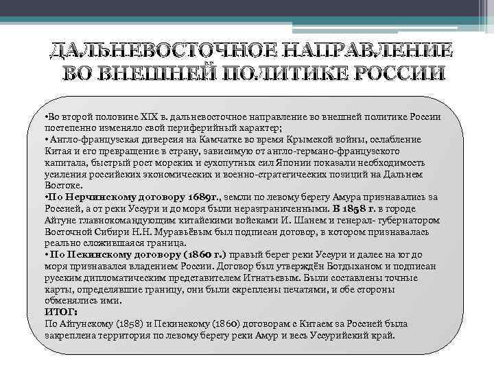 ДАЛЬНЕВОСТОЧНОЕ НАПРАВЛЕНИЕ ВО ВНЕШНЕЙ ПОЛИТИКЕ РОССИИ • Во второй половине XIX в. дальневосточное направление во внешней политике России постепенно изменяло свой периферийный характер; • Англо-французская диверсия на Камчатке во время Крымской войны, ослабление Китая и его превращение в страну, зависимую от англо-германо-французского капитала, быстрый рост морских и сухопутных сил Японии показали необходимость усиления российских экономических и военно-стратегических позиций на Дальнем Востоке. • По Нерчинскому договору 1689 г. , земли по левому берегу Амура признавались за Россией, а от реки Уссури и до моря были неразграниченными. В 1858 г. в городе Айгуне главнокомандующим китайскими войсками И. Шанем и генерал- губернатором Восточной Сибири Н. Н. Муравьёвым был подписан договор, в котором признавалась реально сложившаяся граница. • По Пекинскому договору (1860 г. ) правый берег реки Уссури и далее на юг до моря признавался владением России. Договор был утверждён Богдыханом и подписан русским дипломатическим представителем Игнатьевым. Были составлены точные карты, определявшие границу, они были скреплены печатями, и обе стороны обменялись ими. ИТОГ: По Айгунскому (1858) и Пекинскому (1860) договорам с Китаем за Россией была закреплена территория по левому берегу реки Амур и весь Уссурийский край.
