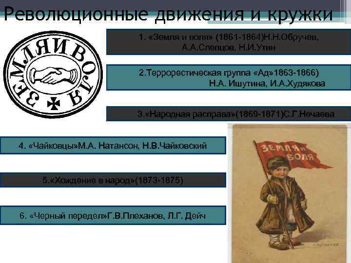 Революционные движения и кружки 1. «Земля и воля» (1861 -1864)Н. Н. Обручев, А. А. Слепцов, Н. И. Утин 2. Террорестическая группа «Ад» 1863 -1866) Н. А. Ишутина, И. А. Худякова 3. «Народная расправа» (1869 -1871)С. Г. Нечаева 4. «Чайковцы» М. А. Натансон, Н. В. Чайковский 5. «Хождение в народ» (1873 -1875) 6. «Черный передел» Г. В. Плеханов, Л. Г. Дейч